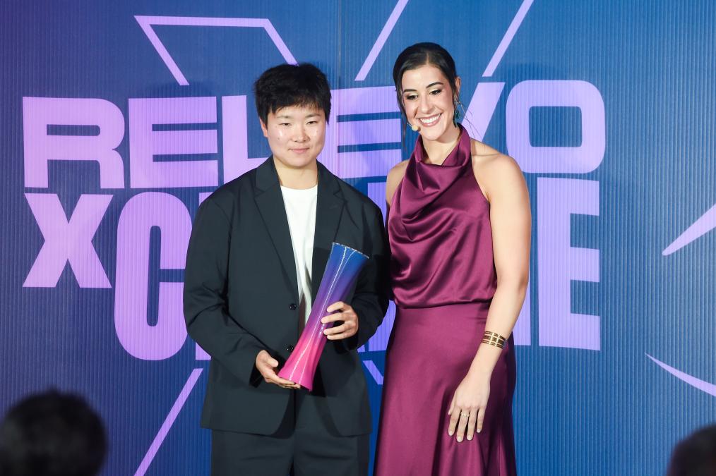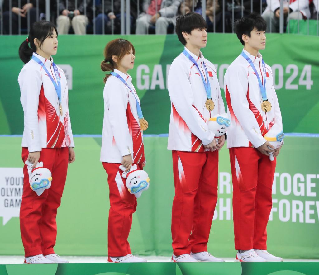 1月24日,中国队选手李金恣、杨婧茹、张柏浩和张心喆(从左至右)在2024年江原道冬青奥会短道速滑混合团体接力颁奖仪式上。