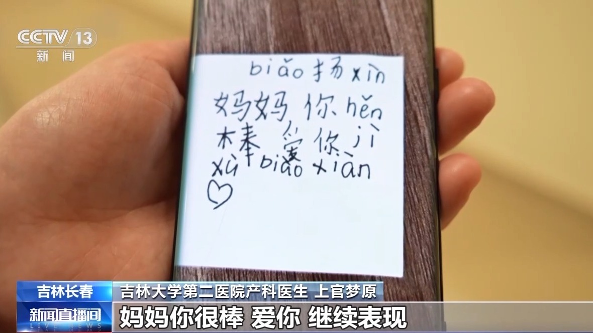 吉林大学第二医院产科医生 上官梦原:这一年中我觉着,我最要感谢的人是我女儿。她给了我很多陪伴和鼓励,因为我平时陪她的时间很少,但是只要是陪她在一起的时候,她就会非常开心。就觉得我这个妈妈表现得非常好,其实我表现得远远都不够。然后有一次我陪她就上了一节课,回来之后她就给我写了一个小纸条,写了一个“表扬信”,妈妈你很棒!爱你,继续表现。