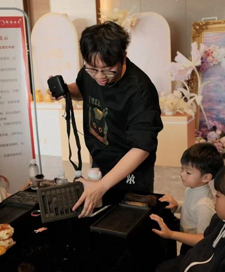 2024年11月,温州瑞安社区内,潘昱丞给小朋友讲解活字印刷技术。图片由受访者提供
