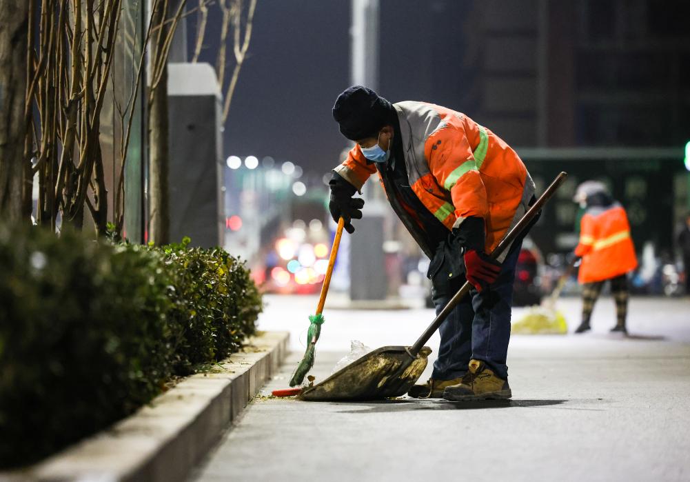 2025年1月1日清晨,河北省石家庄市新华区环卫工人在中华北大街清扫街道。新年伊始,各行各业的劳动者坚守岗位,铆足干劲,接续奋斗。新华社发(梁子栋摄)