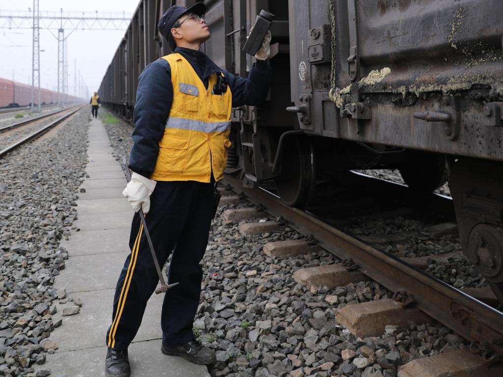 中国铁路成都局集团有限公司重庆西车辆段兴隆场上行运用车间货车检车员范洪川在检查车辆。