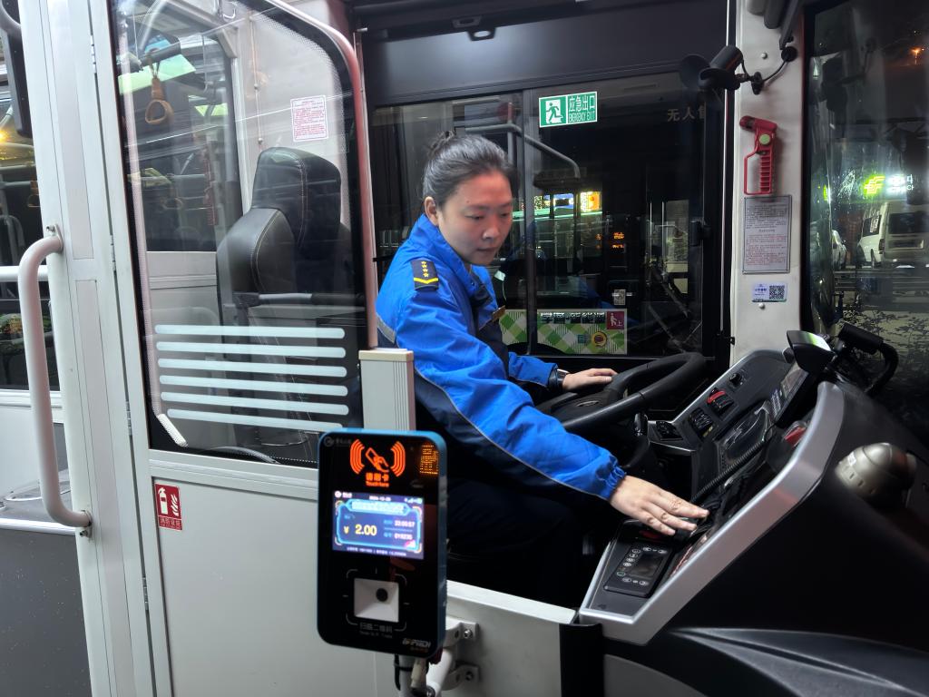 公交车驾驶员张红玫驾驶夜班公交接送乘客。