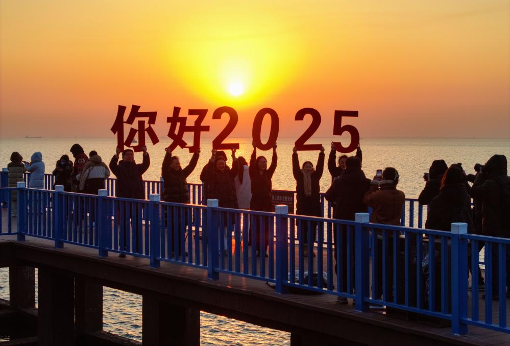2025年1月1日,游客在江苏省连云港市羊山岛迎接新年第一缕阳光。 新华社发(王健民摄)