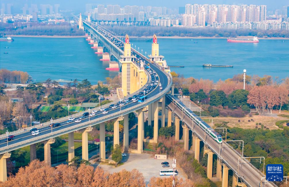 1月4日,一列客运列车从南京长江大桥下驶出(无人机照片)。