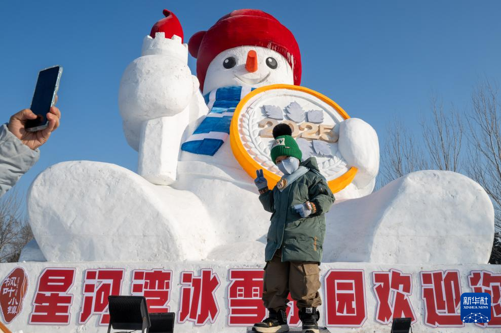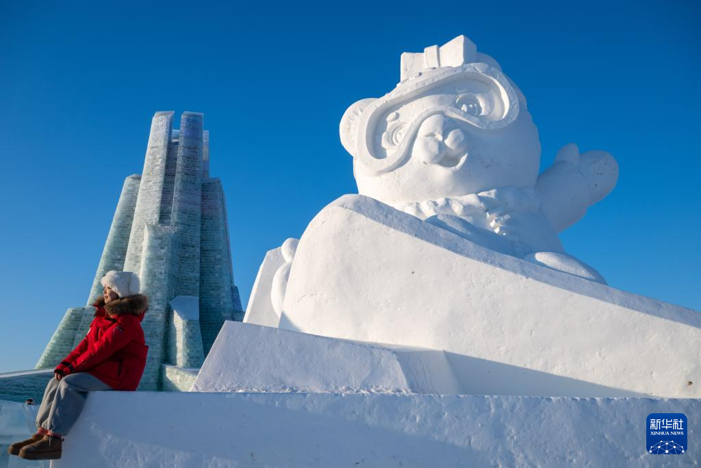 1月3日,在哈尔滨冰雪大世界园区,游客与亚冬会吉祥物雪雕“滨滨”合影。