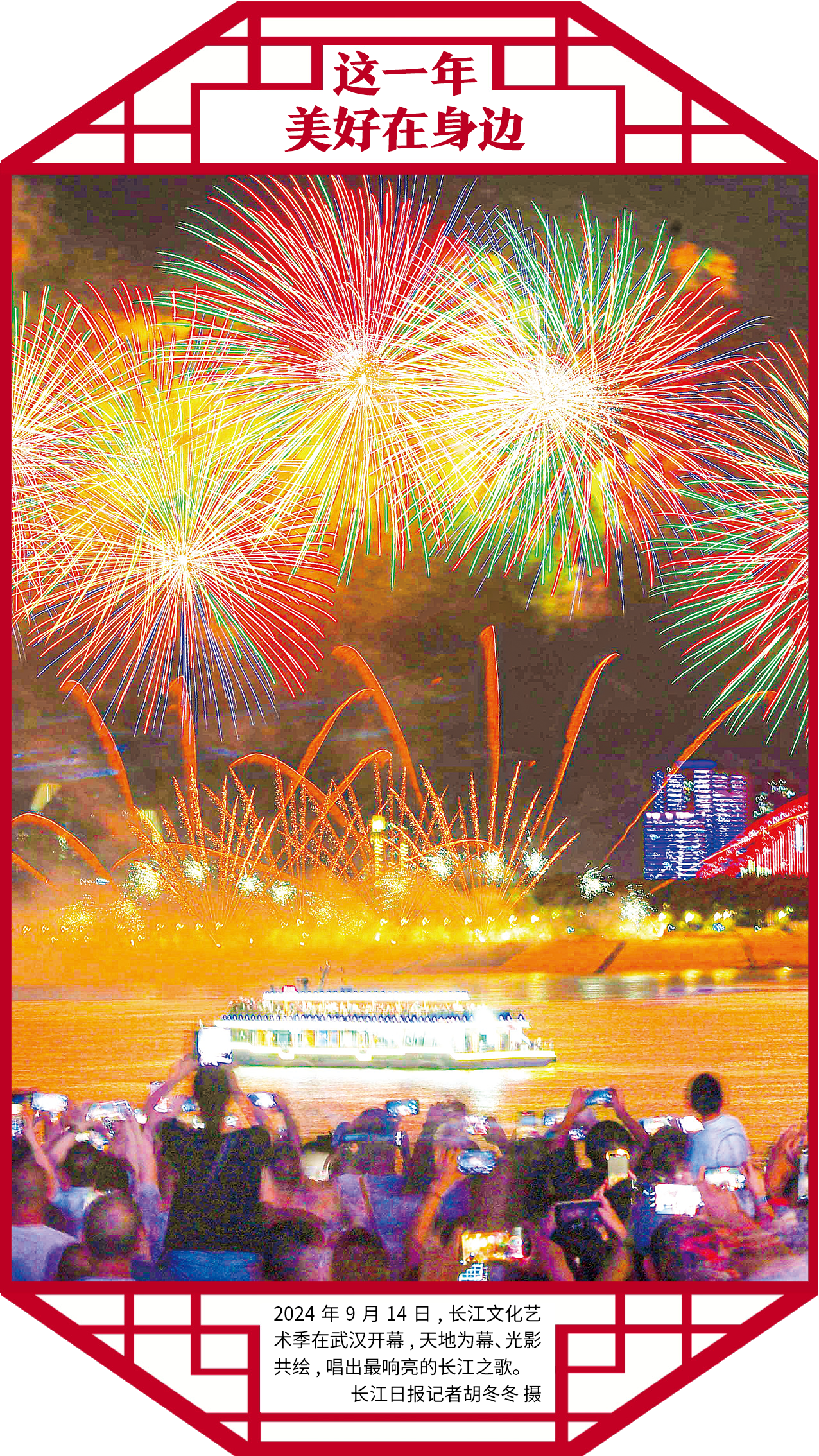 2024年9月14日,首届“长江文化艺术季”在武汉拉开帷幕。整座城市呈现出“以天为幕、以城为景、以长江为舞台”的璀璨景象。开幕式当晚,两江四岸汇聚了数十万市民与游客,观众盛赞:“长江是最美的舞台!”