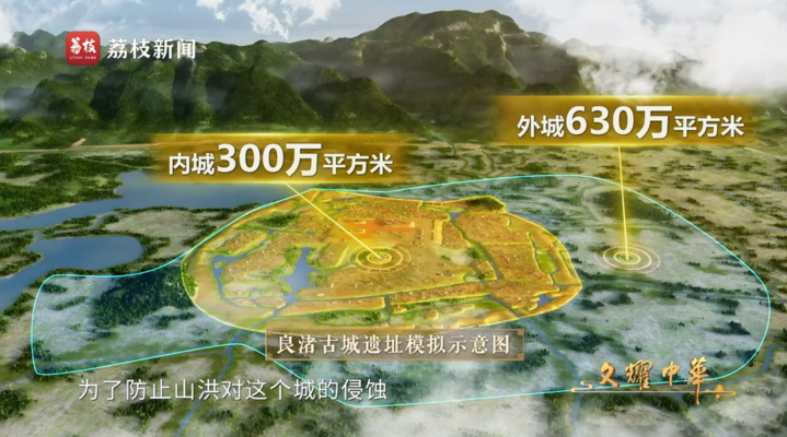 2006年、2007年,在浙江余杭的良渚遗址发现了大型的城址,南北1700米,东西1500米,300万平方米。相当于四个北京故宫。外城630万平方米,相当于八个故宫。为了防止山洪对这个城的侵蚀,在修城之前修建大型的水利工程,总长达数公里,总用工量大约3600万个劳动日。动员1万人,连续工作需要10年。