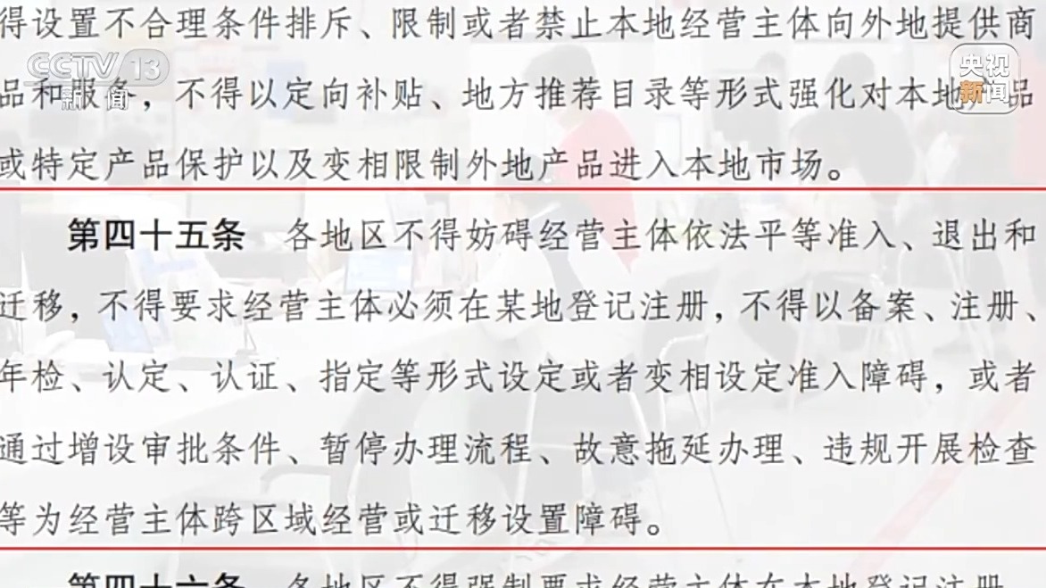 白岩松:构建全国统一大市场点多面广、千头万绪,但概括来说,要破立并举、先立后破。要“立”的是统一的政策、规则和标准。而要“破”的,则是妨碍统一市场和公平竞争的各种规定和做法,尤其是地方保护和市场分割。为此,发改委《指引》中强调了若干个“不得”,各地不得限制商品和要素跨区域自由流动,不得妨碍经营主体依法平等准入、退出和迁移,也不得违法开展异地执法或实行异地管辖等。这相当于给地方政府划出了不能碰的“底线红线”,一旦触碰,就得承担相应责任。有了这些“底线红线”,阻碍大市场的“篱笆墙”能打破吗?