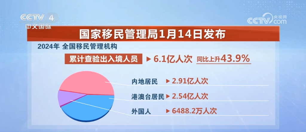 2024年,全国移民管理机构累计查验出入境人员6.1亿人次,同比上升43.9%。其中内地居民2.91亿人次、港澳台居民2.54亿人次、外国人6488.2万人次,同比分别上升41.3%、38.8%、82.9%。