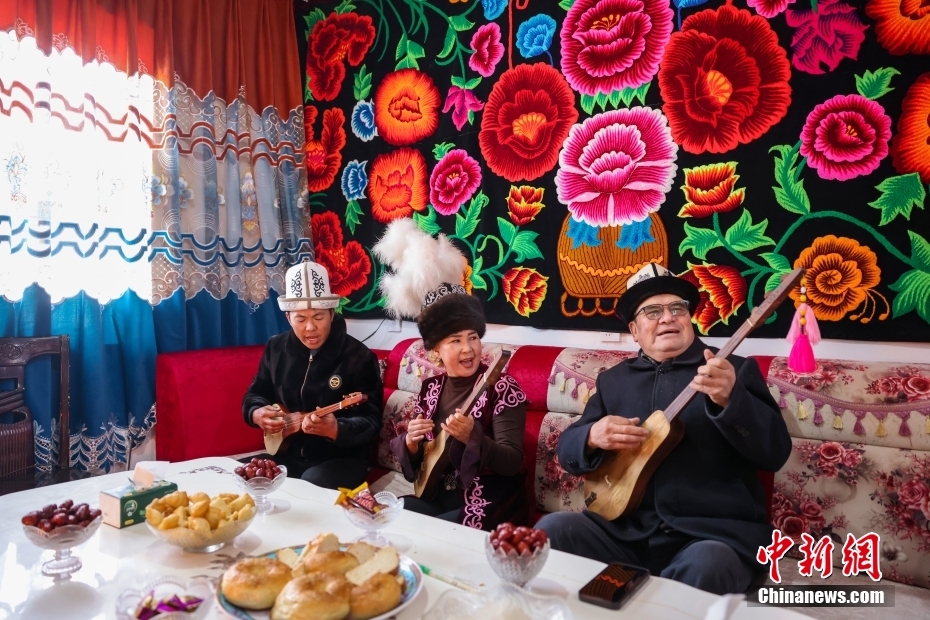 1月13日,新疆阿克苏地区乌什县亚曼苏柯尔克孜族乡幸福新区,村民们在家中弹奏乐器库姆孜。2024年6月30日,41户地震受灾群众迁入幸福新区。当年1月23日凌晨,乌什县发生7.1级地震,部分房屋倒塌或受损。在灾后重建工作中,当地政府进行安置补贴,采取原址重建209户、搬迁新区41户、进城安置42户三类方式安置受灾群众。