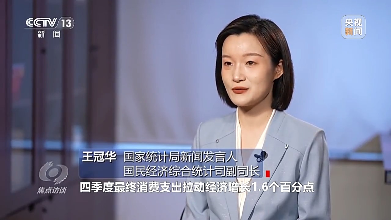 国家统计局新闻发言人、国民经济综合统计司副司长 王冠华:四季度最终消费支出拉动经济增长1.6个百分点,比上个季度提高了0.2个百分点。以冰雪经济、首发经济为代表的消费新场景热度上升,直播带货、即时零售等消费新业态快速发展,还有一些国货潮品,出海又出圈。这些变化增强了对消费市场恢复的信心,同时这些新的趋势也是未来进一步扩大国内需求的重要政策着力点。