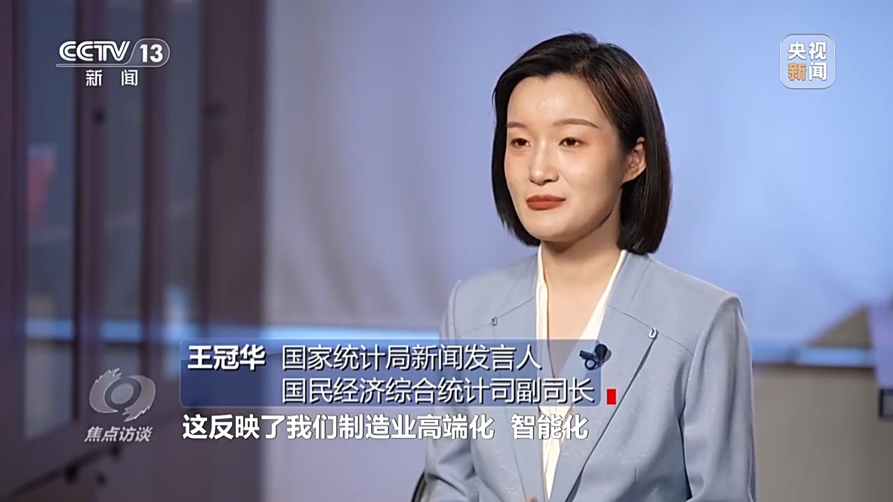 国家统计局新闻发言人、国民经济综合统计司副司长 王冠华:2024年各地在因地制宜发展新质生产力,集成电路、人工智能、量子技术等这些领域都实现了新的突破。装备制造业占规模以上工业的比重超过了34%,高技术制造业在规模以上工业中的比重超过了16%,两个比重都是在稳步提升,反映制造业高端化、智能化、绿色化发展的态势在持续推进。还有一个数据,2024年的每一天,我国有超过8万辆汽车,340万台智能手机下线,4.7亿个快递包裹寄送,中国市场的活力、魅力和潜力有目共睹。