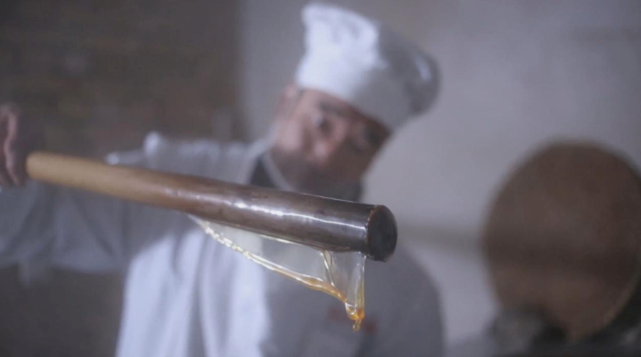 炒糖时,一开始先用棍搅,搅不动以后用木铲铲,直到炒出一些大凝泡以后,这糖就算炒好了。等糖冷却到一定程度,就可以制作糖瓜了。制作糖瓜时,要防止糖在低温下变硬。所以要直接在锅上利用热气扯糖,借着水汽的滋润,锅前的张克明父子将熬好的糖拿出一块,挂在木钩上,开始用手拉扯,焦黄的麦芽糖随着水蒸气不断的熏蒸,在连续拉扯几十次后变得松软而洁白。