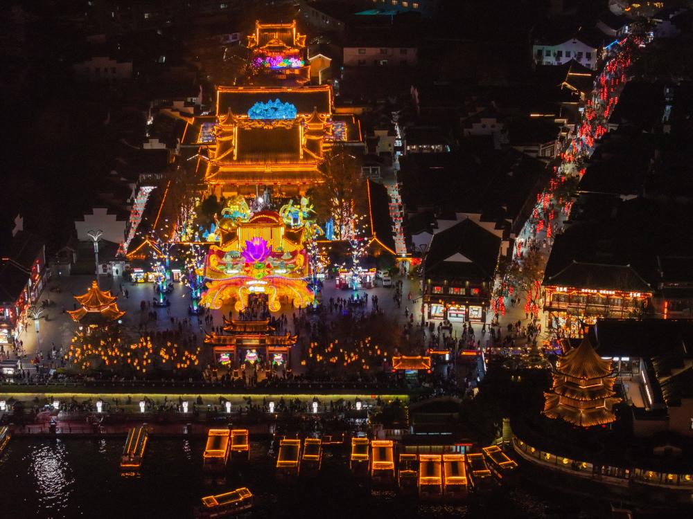 这是1月21日在江苏南京夫子庙展区拍摄的灯组(无人机照片)。新华社记者 李博 摄