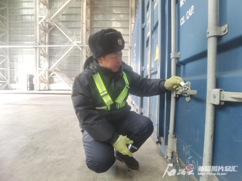 1月20日,谭磊正在阿拉山口站集装箱换装库检查集装箱上的封印。石榴云/新疆日报记者 白素君 摄