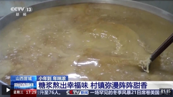 走进山西晋城泽州县周村镇,手艺人介小刚的工坊里,弥漫着阵阵香甜气息,大伙儿正忙碌着制作具有当地特色的糖瓜,为小年增添浓郁的节日氛围。