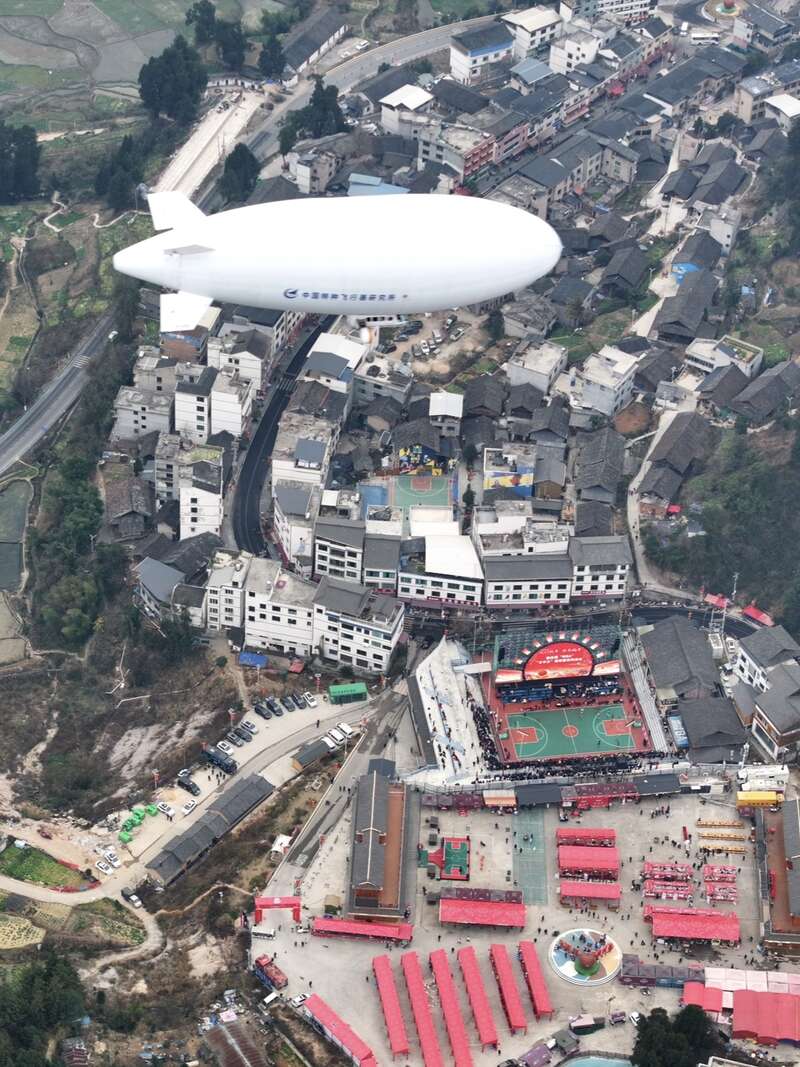 1月22日,贵州黔东南。我国自主研发的AS700“祥云”载人飞艇飞过黔东南“村BA”“王中王”冠军赛现场。中国航空工业集团供图