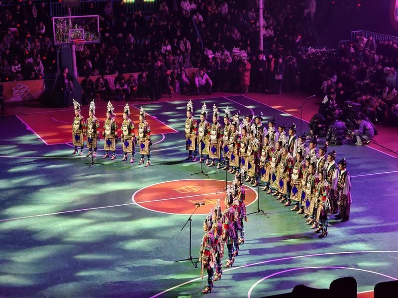1月23日,贵州黔东南。在黔东南“村BA”“王中王”冠军赛现场,村民带来侗族大歌表演。刘胤衡/摄