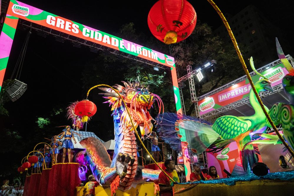 这是2024年2月14日凌晨在巴西贝洛奥里藏特拍摄的“城市花园”舞校的花车。表演主题为“穿越智慧之路 孔雀遇见龙——巴西-中国文化之旅”,庆祝巴中建交50周年并致敬中国龙年。新华社记者 王天聪 摄