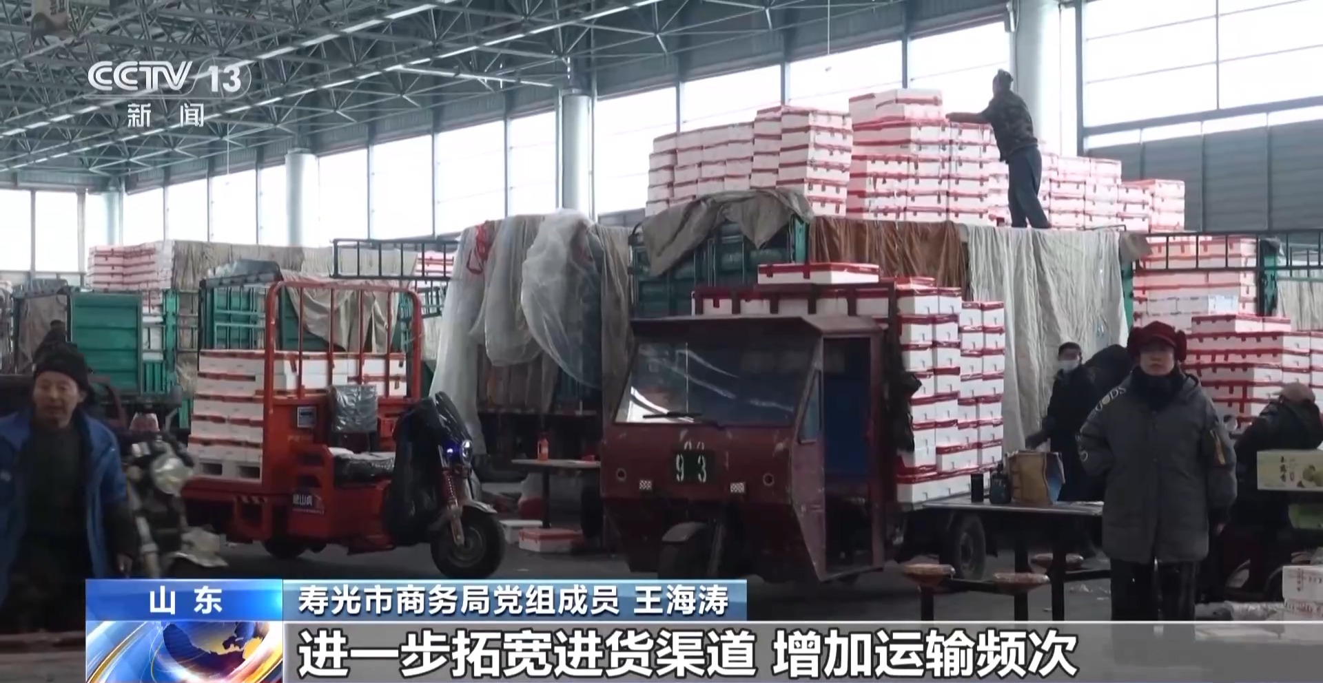 寿光市商务局党组成员 王海涛:春节期间,预计寿光每天约有1.4万吨蔬菜运往全国各地,我们现在正积极调运,加强与各地蔬菜产地及市场紧密合作,进一步拓宽进货渠道、增加运输频次,确保蔬菜不断档,不脱销,供应充足。