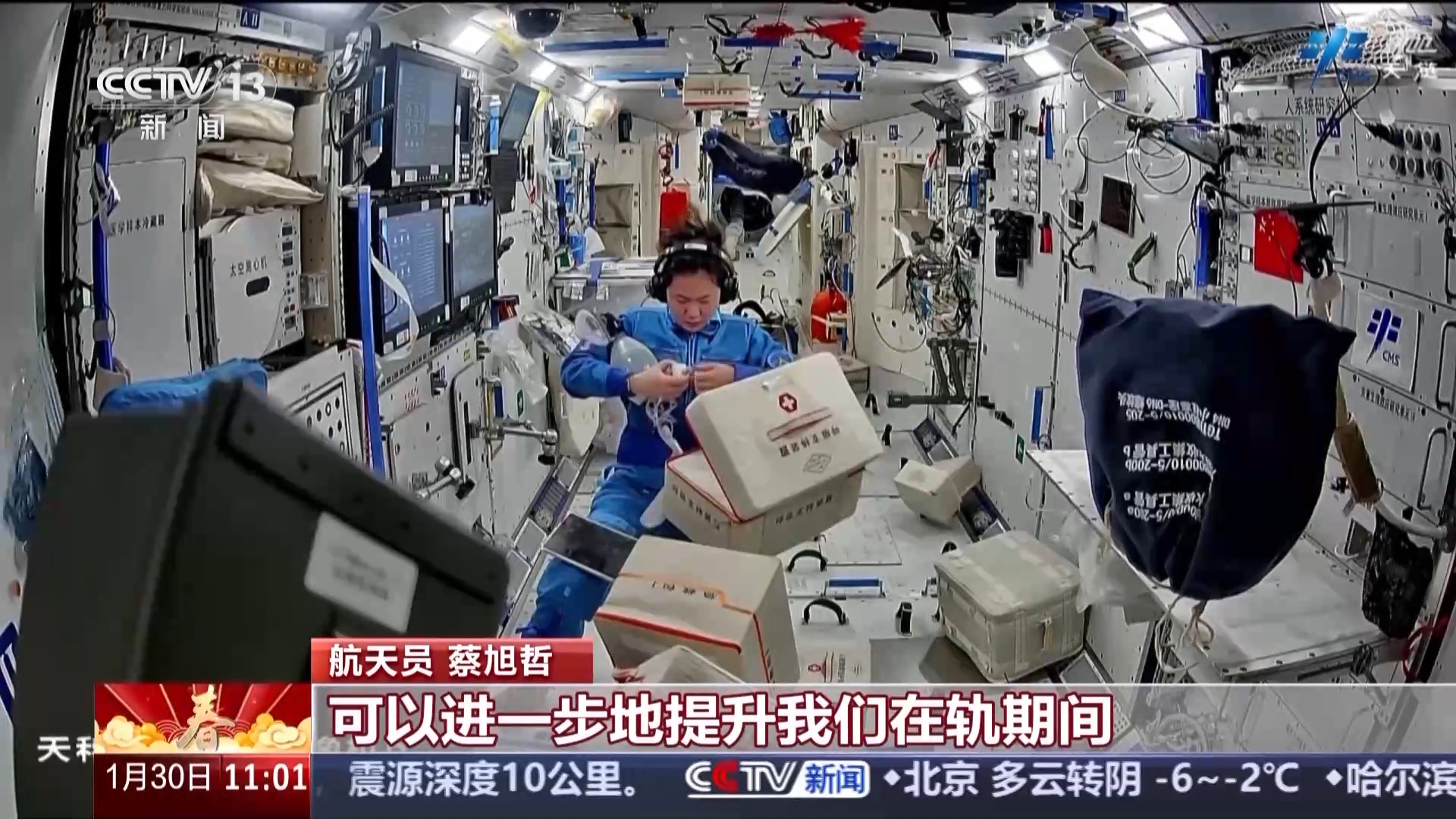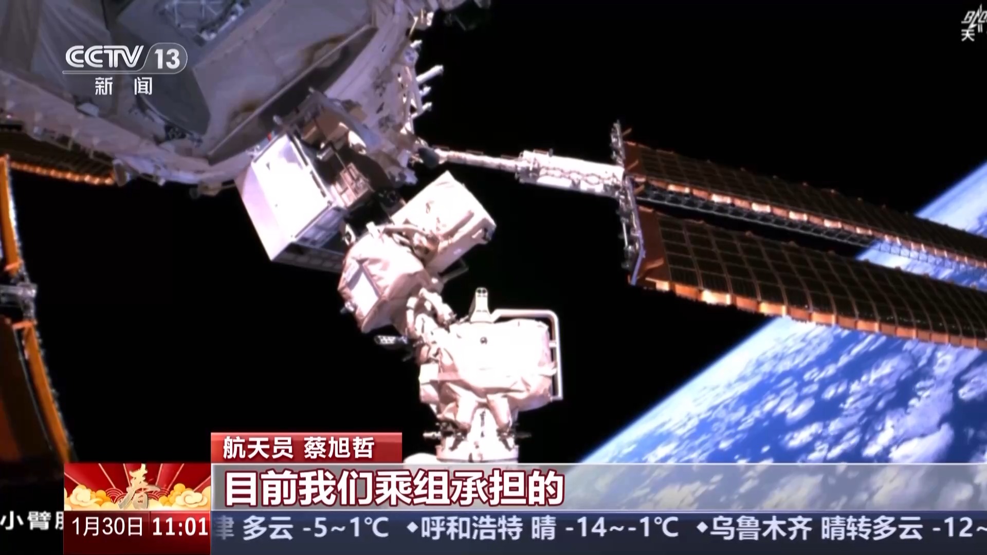 春节期间,我们乘组安排休息,除了一些日常的站务管理工作以外,我们会给家人多打电话拜年,送上一份来自太空的祝福。我们也会多拍一些纪念的视频,拍一些太空和地球的美丽的风景照。我们也会利用这段时间好好地调整一下身心状态,给自己充电。