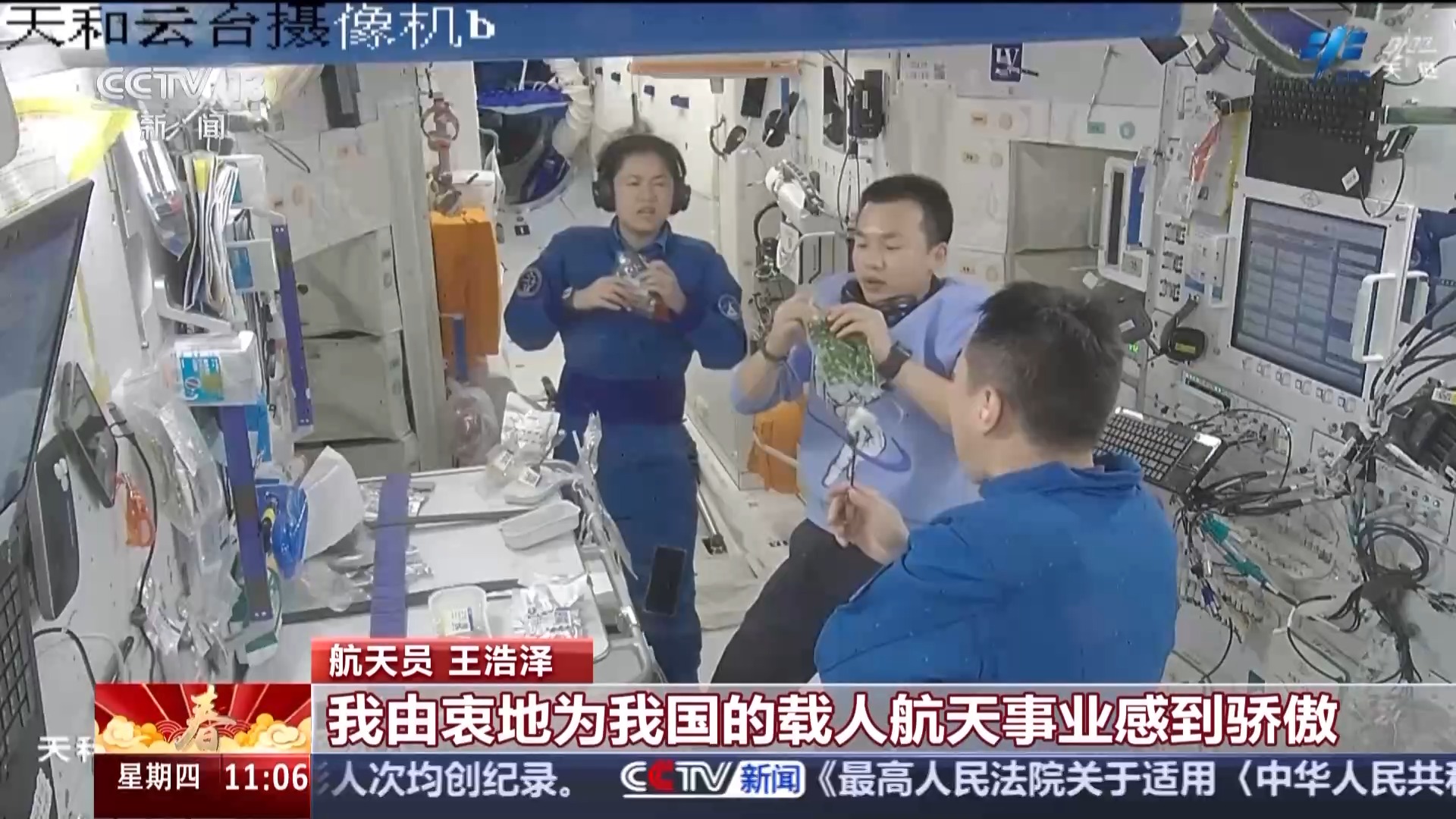 航天员 王浩泽:自从进驻了咱们的太空家园,看到了太空豪宅的三舱两船,看到了站内复杂精密的各个系统。我们也开展了多项前沿的科学实验,我由衷地为我国的载人航天事业感到骄傲。