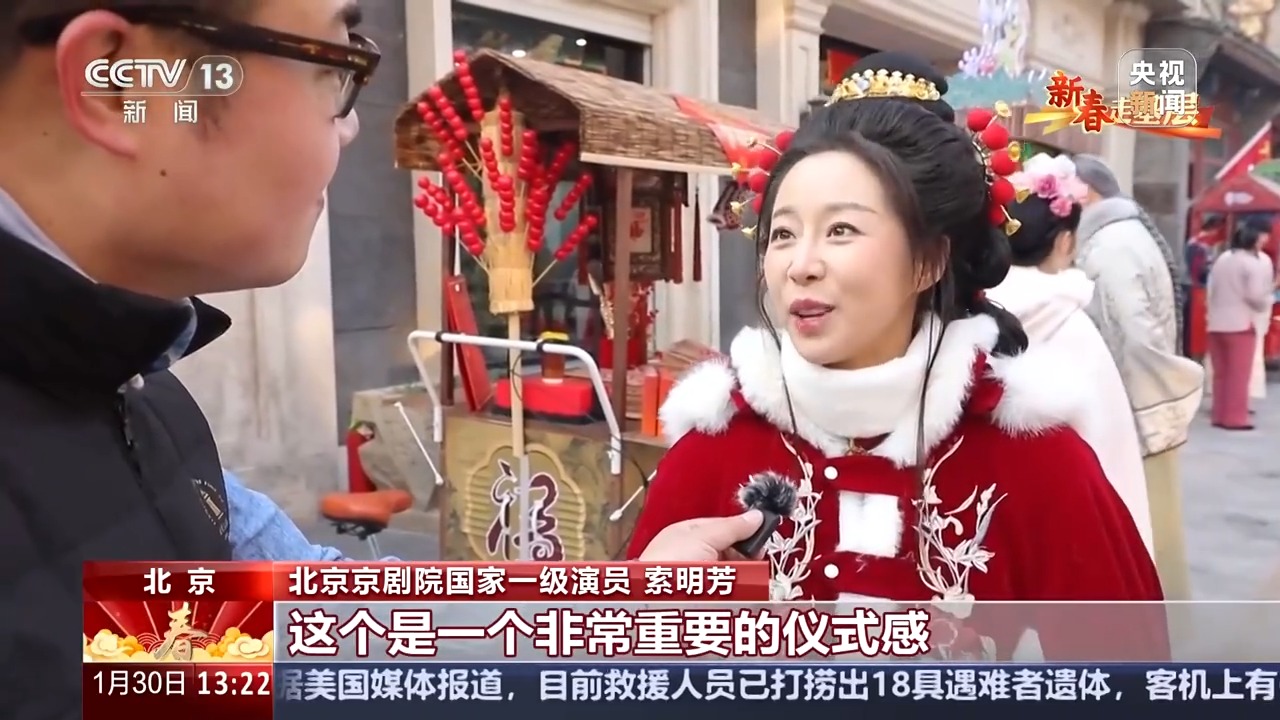 北京京剧院国家一级演员 索明芳:我们叫初一、十五看大戏,就是在过年的时候,这个是一个非常重要的仪式感。我是文保剧社里唯一一个专业性演员,那么可能我比较习惯性的每年只要到了节假日我们都是在工作的状态,但是其实我心里是非常希望能够陪伴孩子以及家人,尤其到了过年的时候,更应该是能够跟家人一起来过,所以我跟家人也说来厂甸找我。