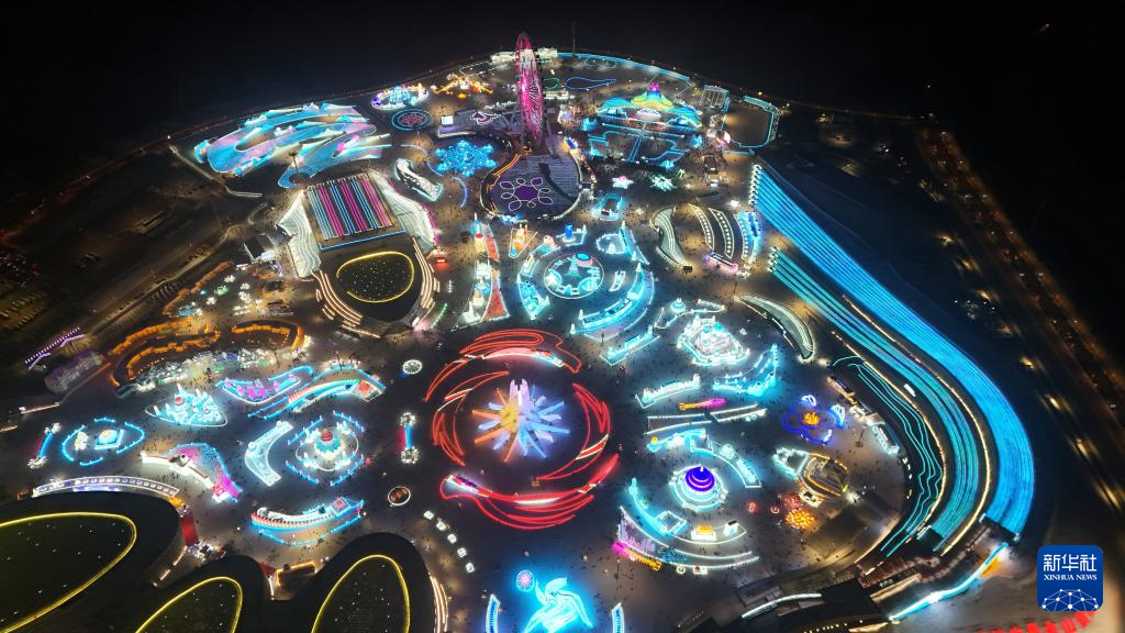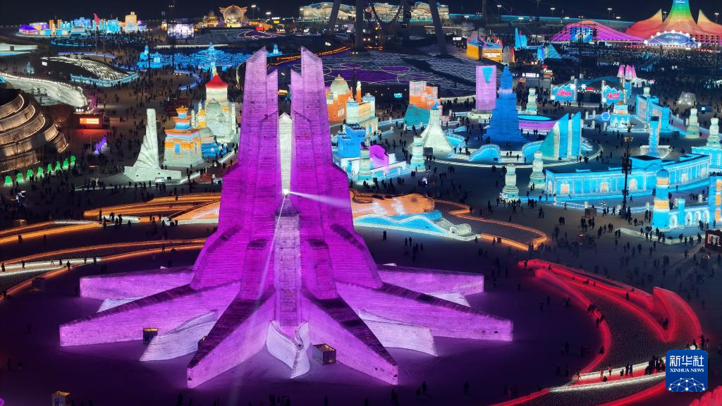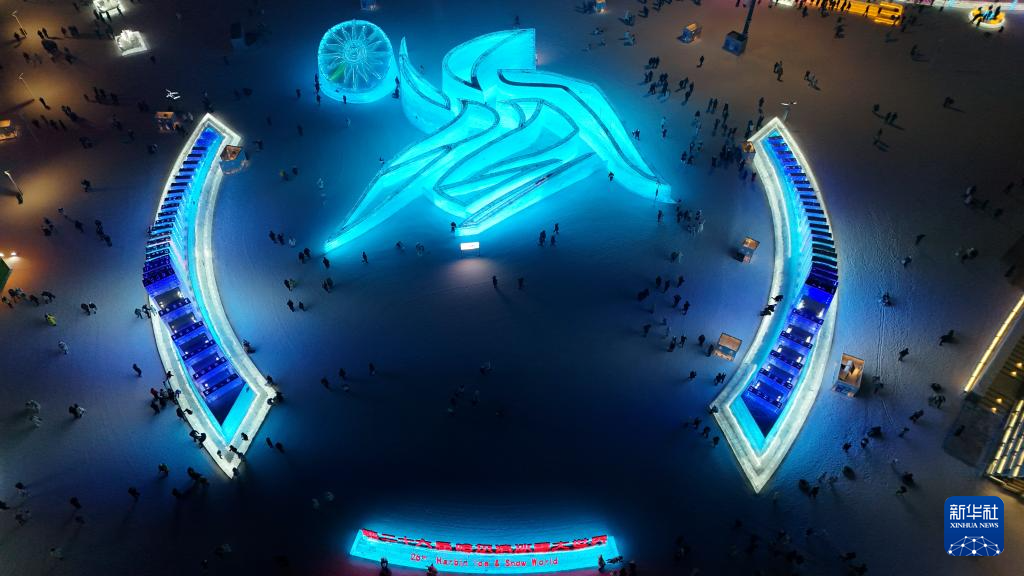这是1月26日拍摄的第二十六届哈尔滨冰雪大世界园区内的第九届亚冬会会徽冰雕,哈尔滨冰雪大世界将作为亚冬会开幕式的分会场(无人机照片)。