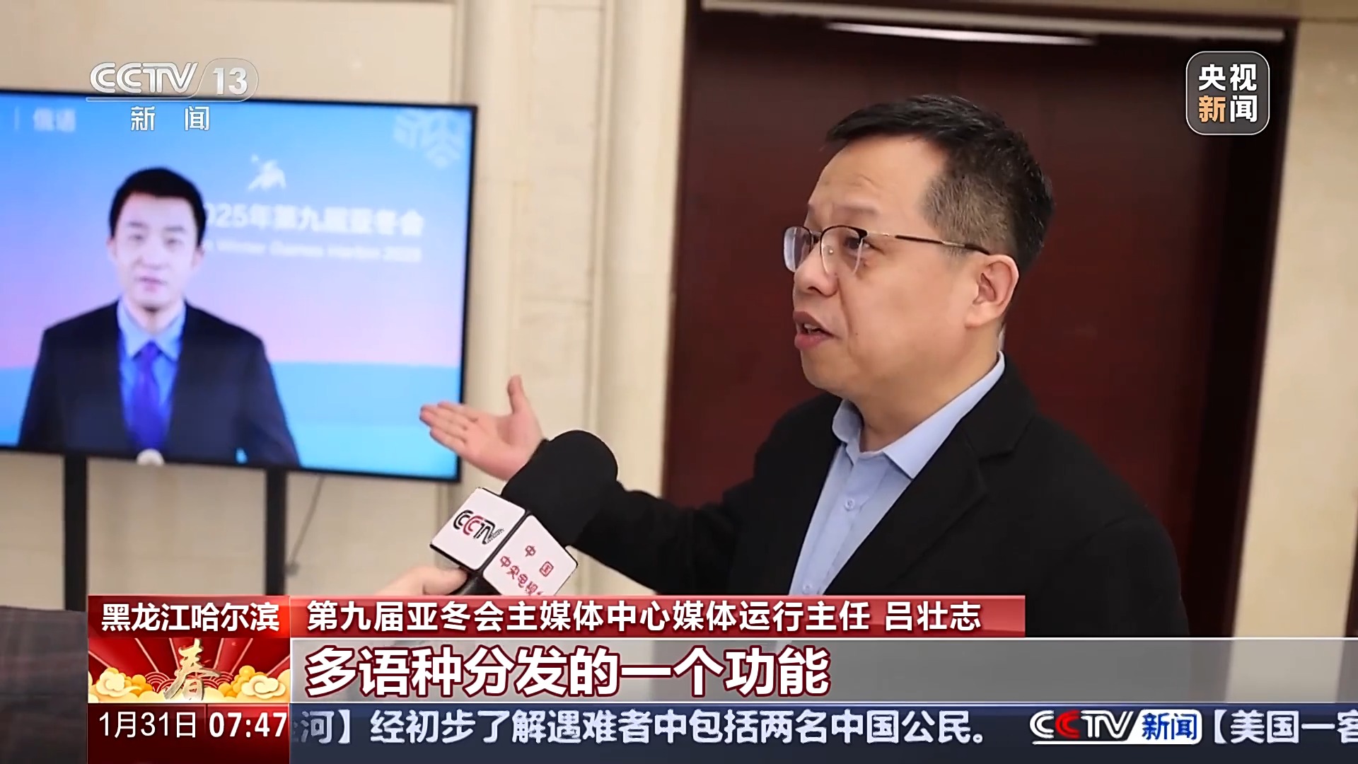 第九届亚冬会主媒体中心媒体运行主任 吕壮志:二十四小时不间断地为中外媒体记者提供全方位的运转流程的服务,在赛会期间,所有的中外媒体记者将在这里享受到IPTV的全流程的覆盖。此次亚冬会首次实现单语种采访、多语种分发的一个功能。