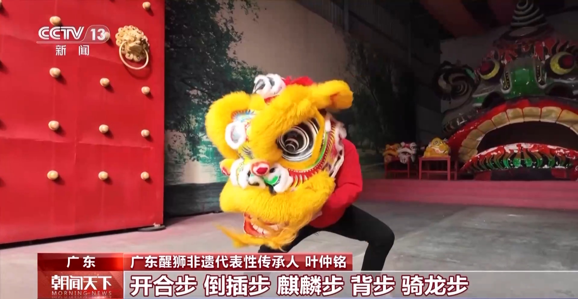 广东醒狮非遗代表性传承人 叶仲铭:南狮的步行步法全部是来源于武术的步行步法。开合步、倒插步、麒麟步、背步、骑龙步、虚步、吊马、金鸡独立步等等,都会出现在舞狮当中。梅花桩也是一种舞狮当中的阵法,当中有河流有山,其实是给人一种启发,要勇往直前,勇于承担责任,继续为美好明天出发。