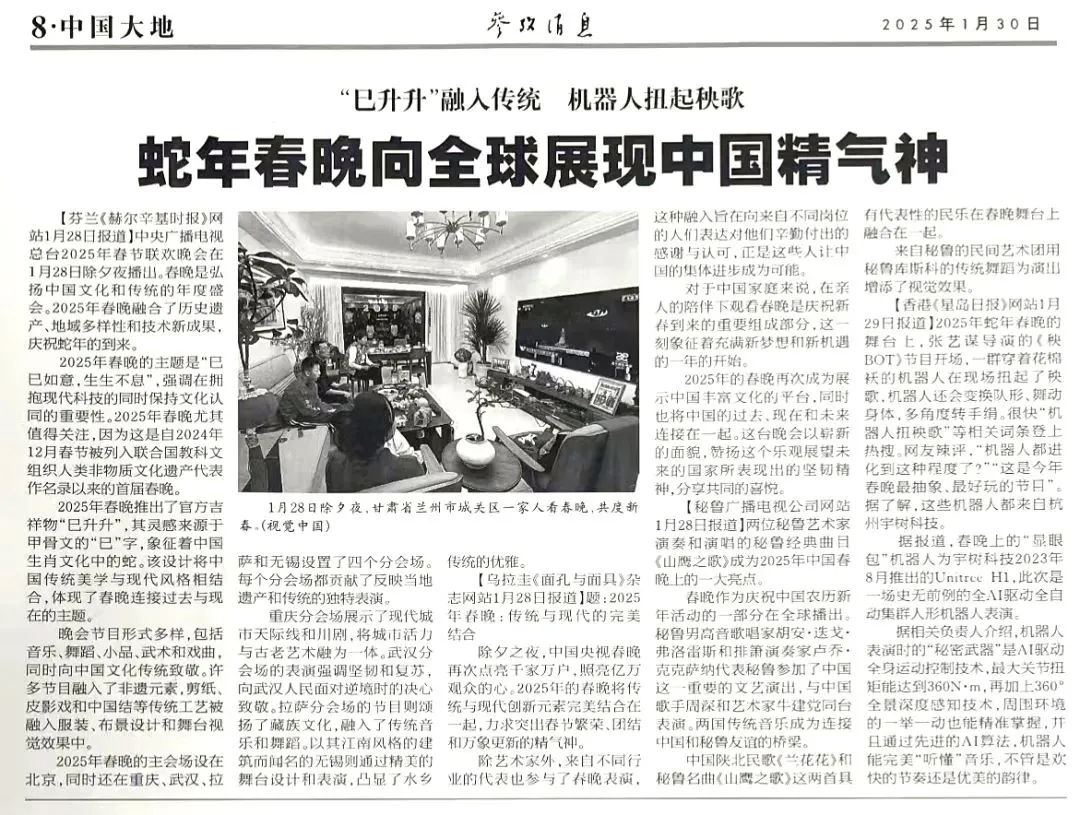 △1月30日出版的《参考消息》刊发多家境外媒体报道,认为总台蛇年春晚向全球展现中国精气神