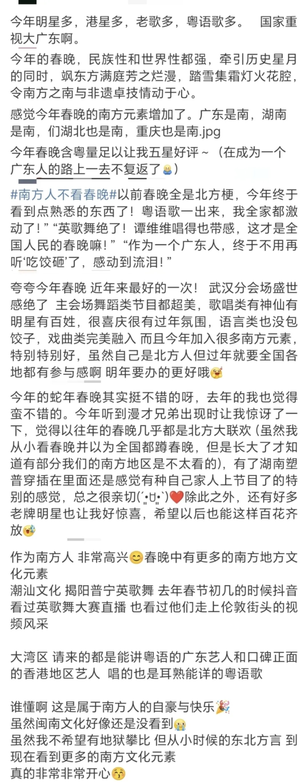“头一次对‘联欢’两个字感觉这么强烈。”在真情实感的春晚观后感里,能看到网友对“含粤量”的由衷好评,对家乡元素的自豪和共鸣,还有对春晚民族性和世界性的赞美。用心用情,美美与共,这是一台属于每个中国人民的联欢晚会。