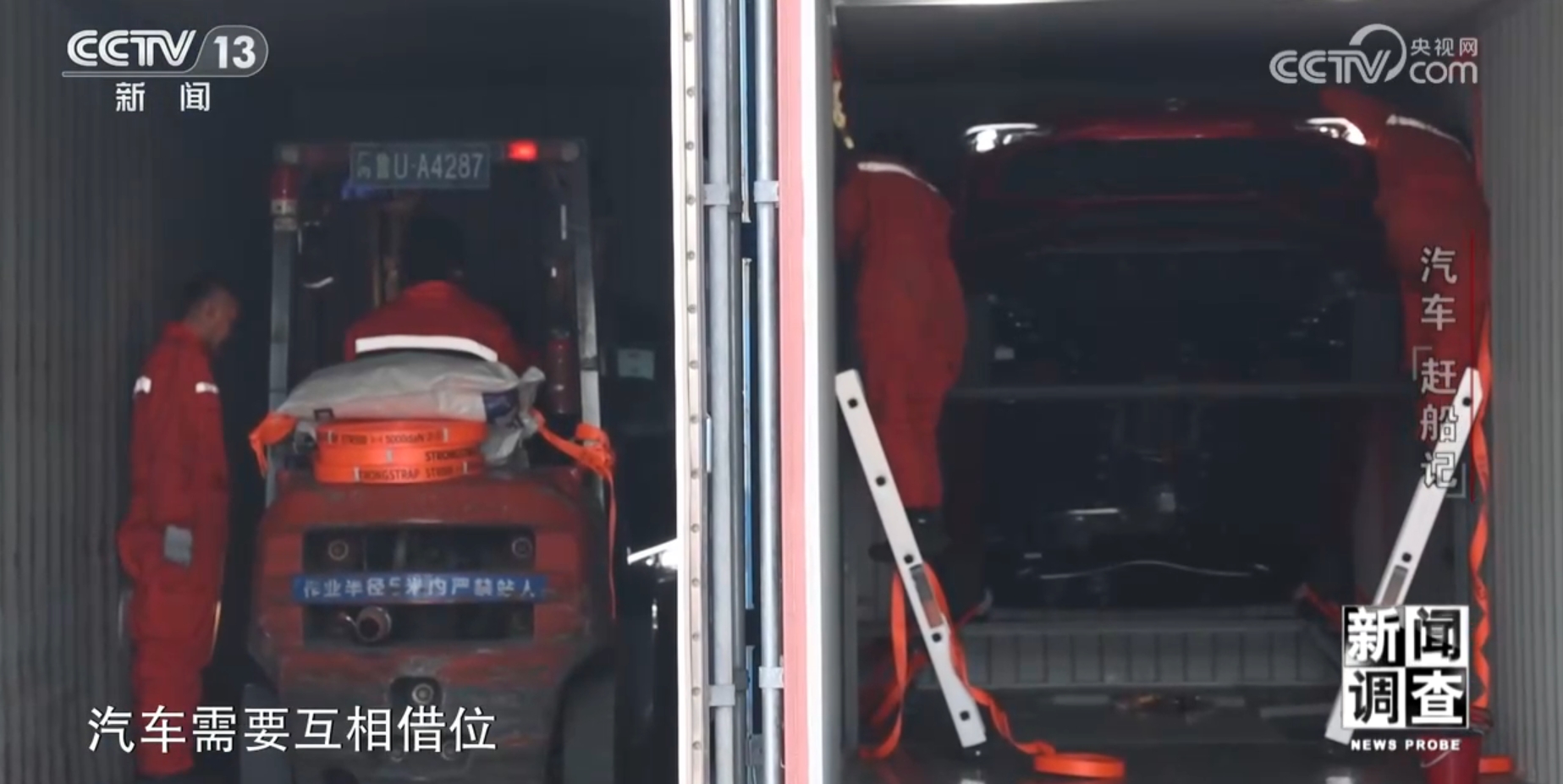 由于集装箱长度有限,汽车需要互相借位。