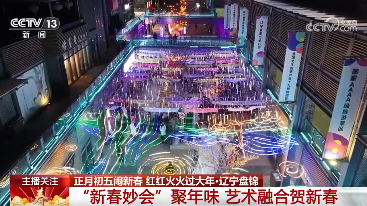 总台记者 李承泽:随着夜幕降临,华灯璀璨,整条街区被装点的流光溢彩,现场年味十足,也非常热闹。现场不仅有传统的民俗表演、非遗展示,还有现代的艺术展览和创意美食,可以说是将传统和现代相融合,碰撞出了浓浓的年味儿。
