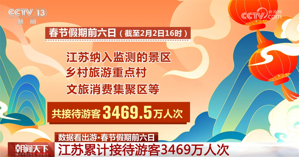 央视网消息:春节假期出游热,一组数据看哪里游客多。春节假期前六天,截至2月2日16时,江苏纳入监测的景区、乡村旅游重点村、文旅消费集聚区等地点共接待游客3469.5万人次,文旅市场持续火爆。