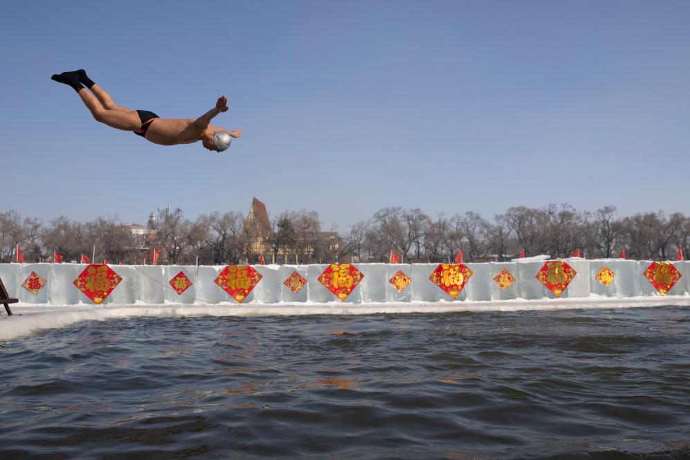 2022年1月31日,冬泳爱好者跃入松花江中。