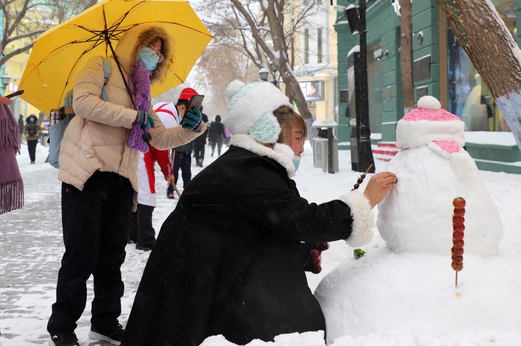 2020年11月19日,游客在哈尔滨市中央大街堆雪人。