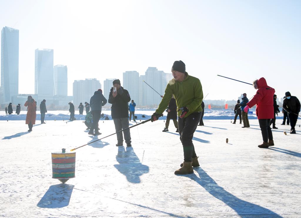 2023年12月7日,市民在第四届哈尔滨采冰节活动现场抽冰尜。