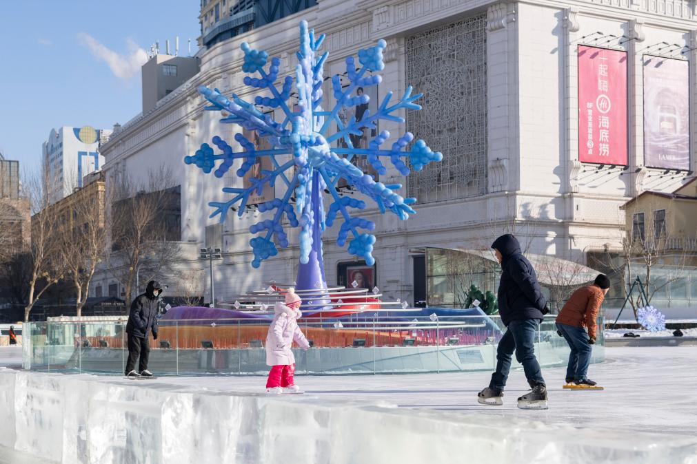 2025年1月4日,在哈尔滨市南岗区一处公益冰场,人们在“冰雪之冠”雕塑旁滑冰。