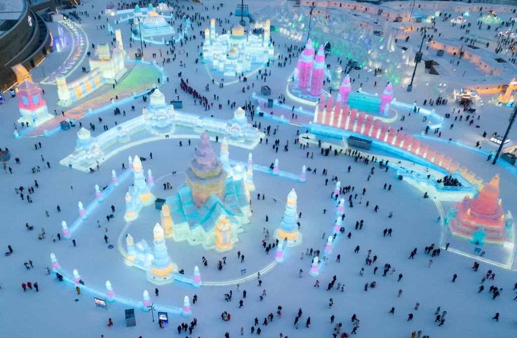 2025年1月5日,游客在哈尔滨冰雪大世界园区内游玩(无人机照片)。