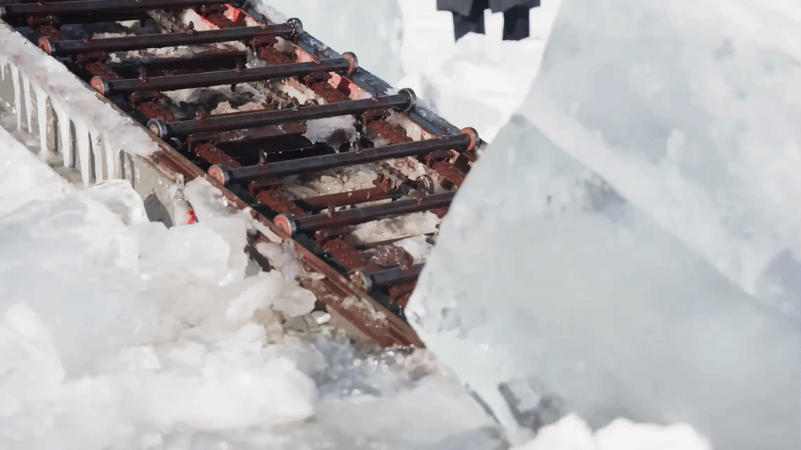 电锯飞转、冰屑飞溅