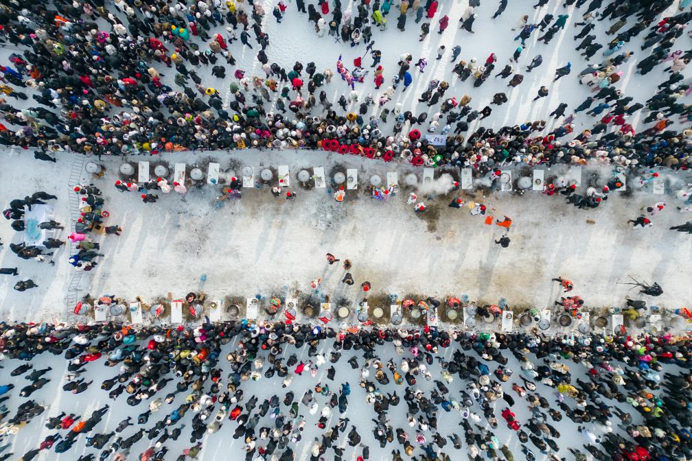2024年12月7日,市民和游客在第五届哈尔滨采冰节现场品尝美食(无人机照片)。