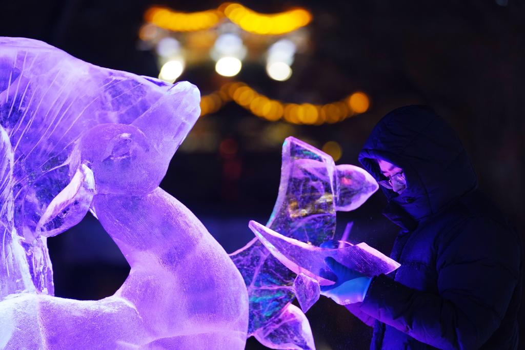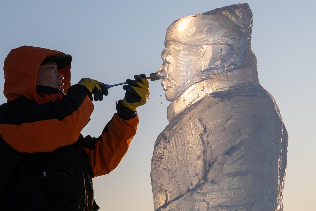 2025年1月4日,在哈尔滨冰雪大世界园区,大庆师范学院美术与设计学院冰雕团队的成员在雕刻“冰马俑”。