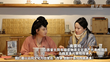 在云冈石窟景区内的一家北魏茶食非遗体验店内,游客们正品尝、购置着各式各样的传统茶食。