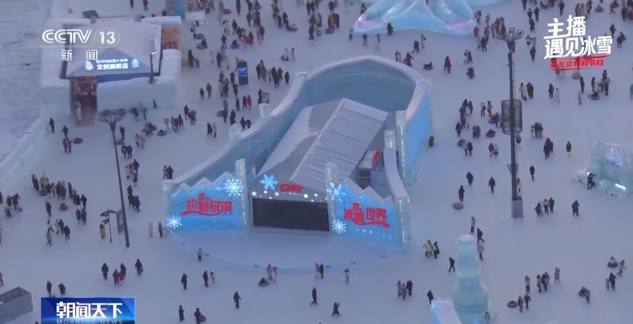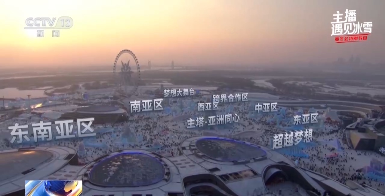 主播 王音棋:来到这个梦幻般的冰雪世界,仿佛展开了一幅冰雪版的清明上河图。从飞机上面俯瞰,冰雪大世界的九大主题区域尽收眼底。除了冰雪同梦区、亚洲同心区、雪山光影区和冰雪欢乐汇区,还有来自亚奥理事会42个成员国和3个地区的代表性的建筑冰雕群。每一个区域都通过独特的冰雕和雪雕作品,展现了亚洲各国的文化特色和历史底蕴。从空中俯瞰,整个冰雪大世界就宛如一座璀璨的冰雪王国,灯光和冰雕交相辉映,美不胜收。