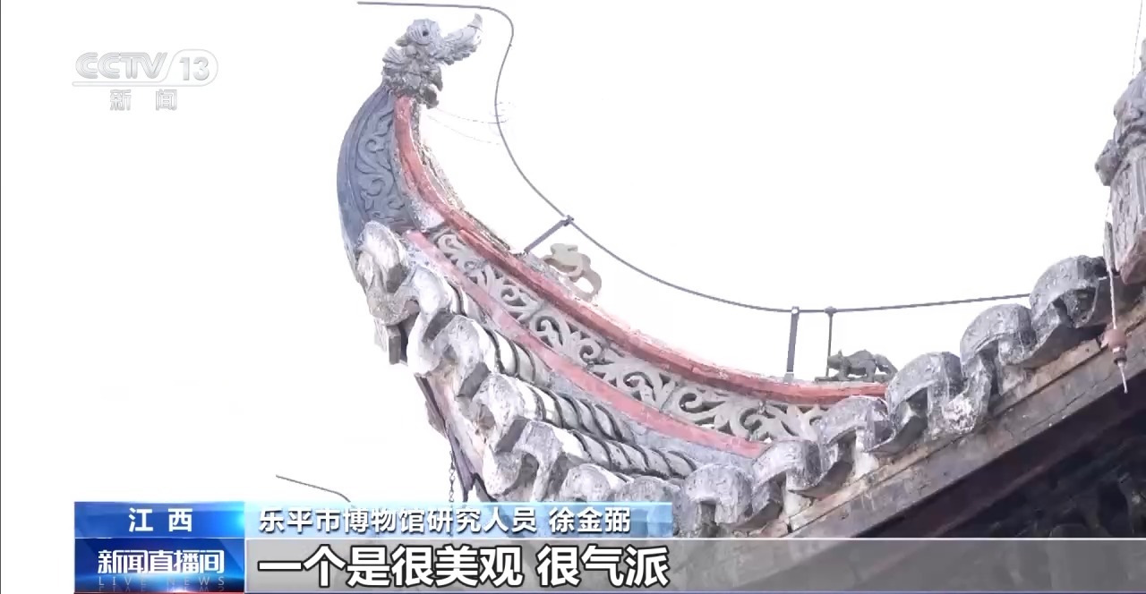 乐平市博物馆研究人员 徐金弼:宝顶在古建筑里面一般都有,一个是很美观、很气派。它可以避雷,起保护古建筑作用。戏台翘角,它有两个功能,一个防水,一个采光,气势恢宏。