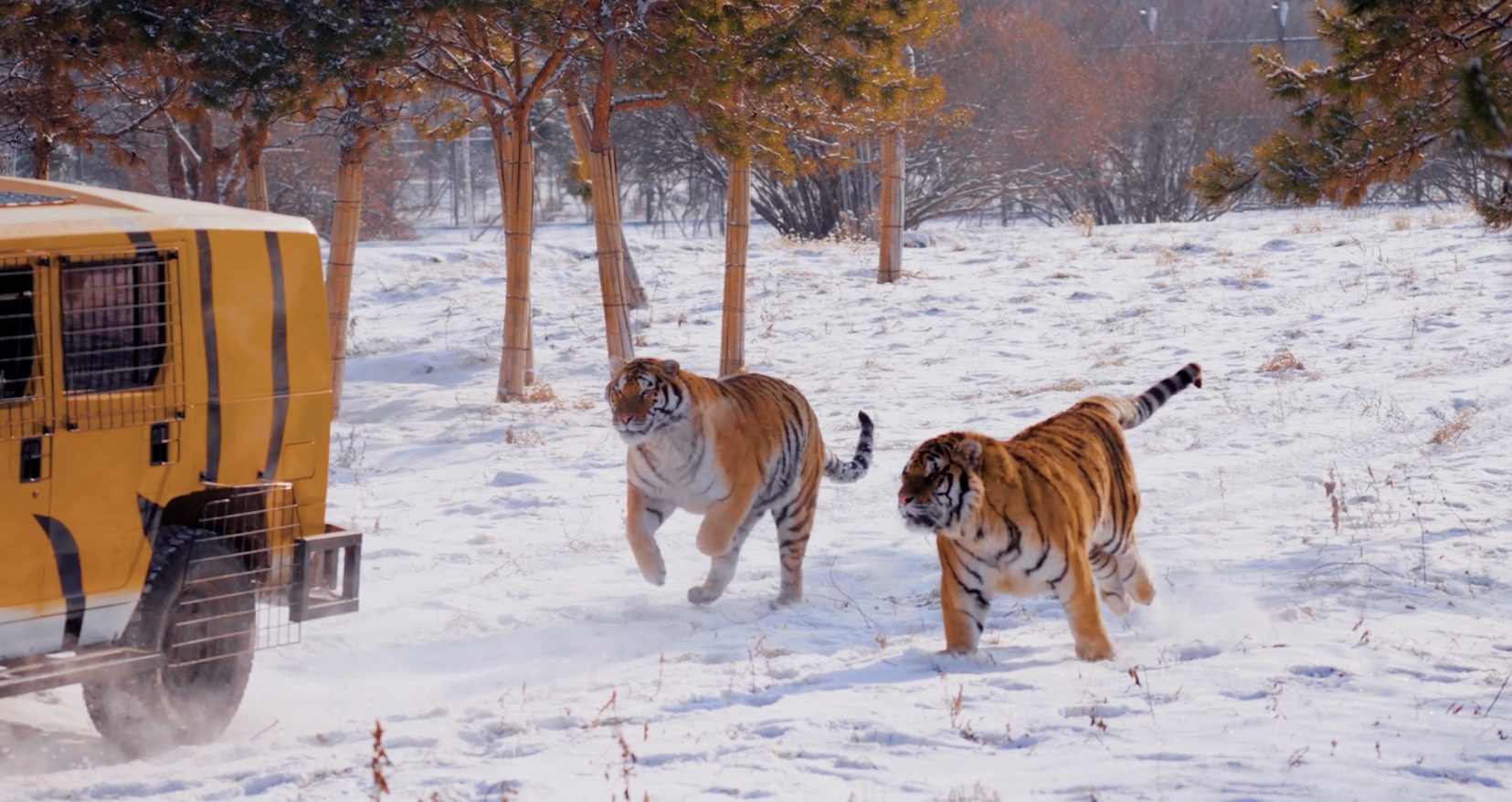 两只小老虎在雪地里相互追逐打闹