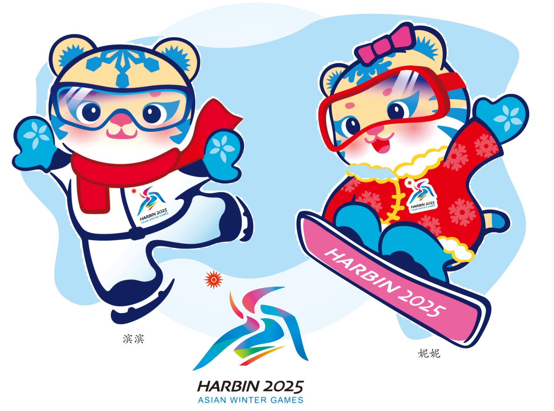 本届亚冬会的吉祥物,是两只可爱的东北虎。脚上穿着冰刀的那只小老虎,名字叫“滨滨”,哈尔滨的“滨”;另一个脚踩滑雪板的,名叫“妮妮”,谐音是“您”。合在一起,寓意为“哈尔滨欢迎您”。