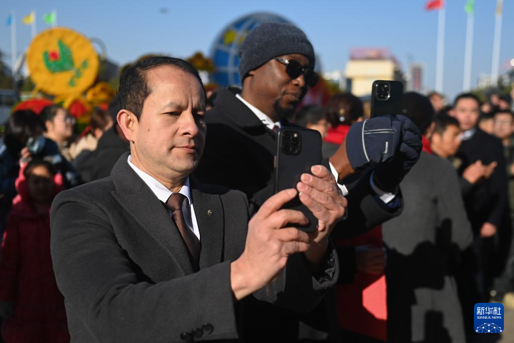2月9日,来自尼泊尔的客商(左)在义乌国际商贸城观看开市仪式的舞龙表演。