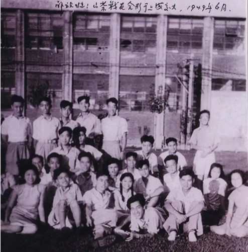 上海解放后,“山茶社”社员在上海交通大学校园合影,前排卧者为黄旭华。新华社发